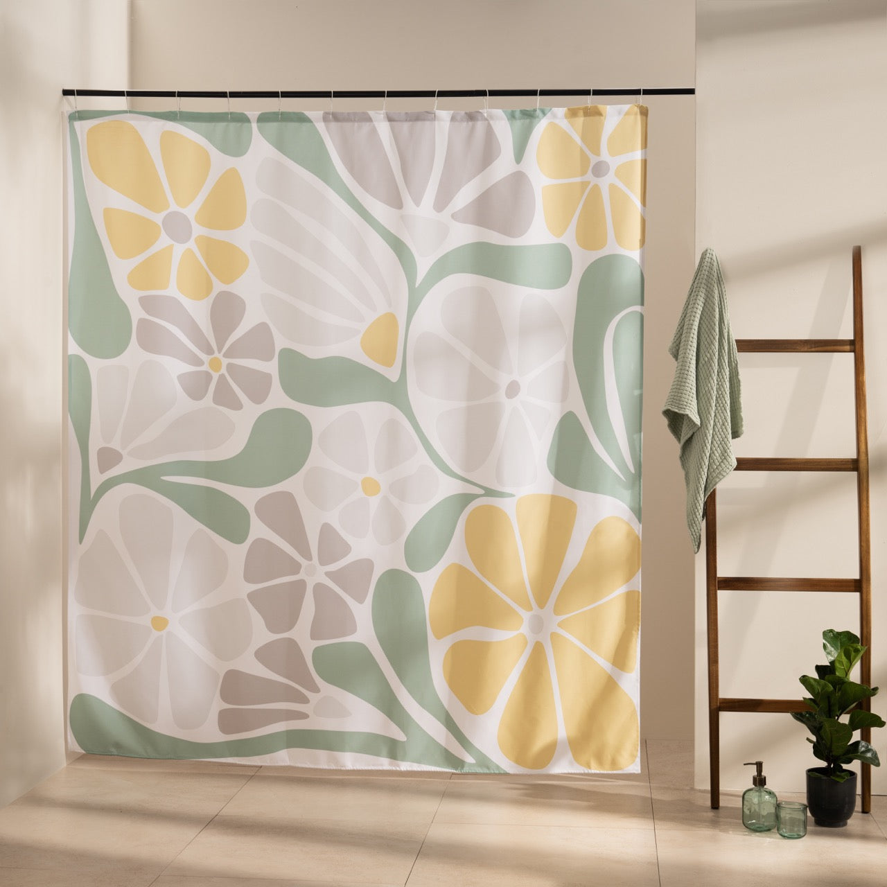 Give your shower a luxurious upgrade with the serene beauty of the "Botanical Bliss" floral abstract shower curtain. Featuring soft pastel hues of green, yellow, and beige in a modern flower-inspired design, this shower curtain brings a sense of fresh springtime into your space.